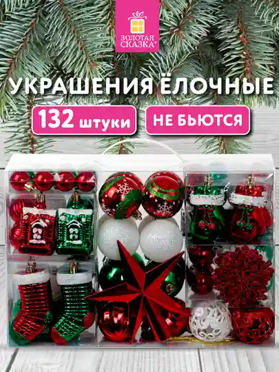 Елочные шары-игрушки Золотая Сказка, 592180, новогодний декор, набор 132 предмета, пластик