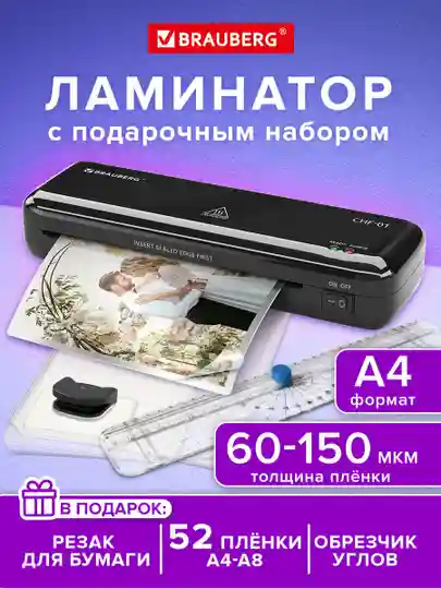 Ламинатор бумаги A4 Brauberg, резак обрезчик углов пленка 52шт, толщина до 150 мкм, 532861