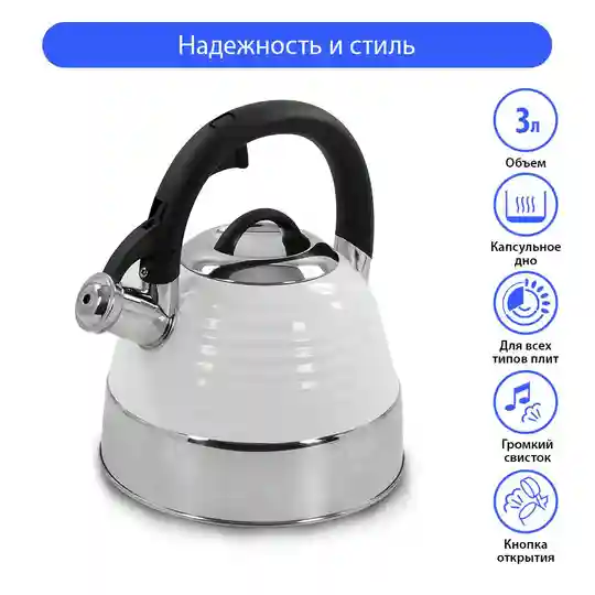 Чайник со свистком MARTA MT-3098 3 л, капсульное дно, нержавеющая сталь, белый