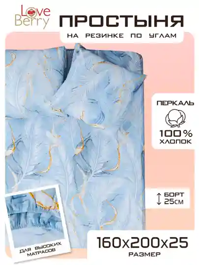 Простыня LOVEBERRY на резинке 160х200 см из перкаля, 100% хлопок