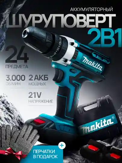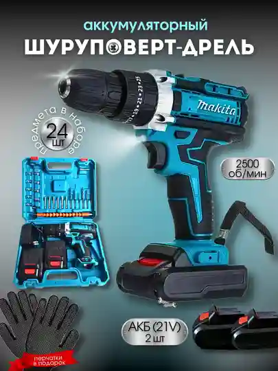 Шуруповерт дрель аккумуляторный с набором инструментов в кейсе, 21 В, 2 АКБ