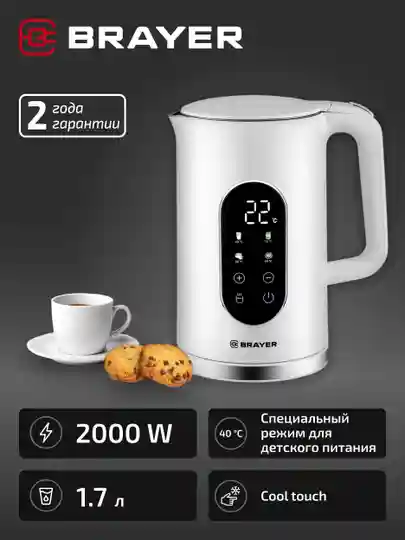 Чайник электрический BRAYER BR6107WH, 2200 Вт, 1,7 л, Cool Touch, cенсорное управление