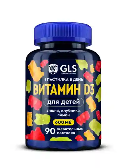 БАД к пище для детей GLS "Витамин D3", клубника, вишня, лимон, 90 пастилок жевательных