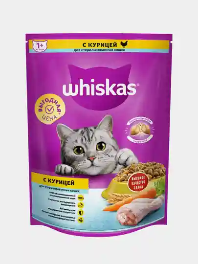 Сухой корм WHISKAS для стерилизованных кошек, с курицей и вкусными подушечками, 350г
