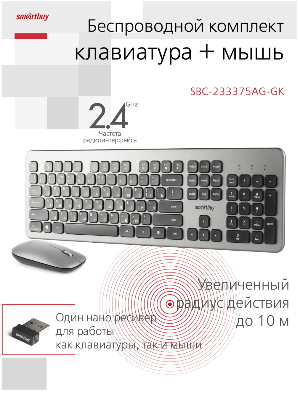 Клавиатура и мышь беспроводной комплект Smartbuy 233375AG,для компьютера, серебристый, черные прорезиненные клавиши