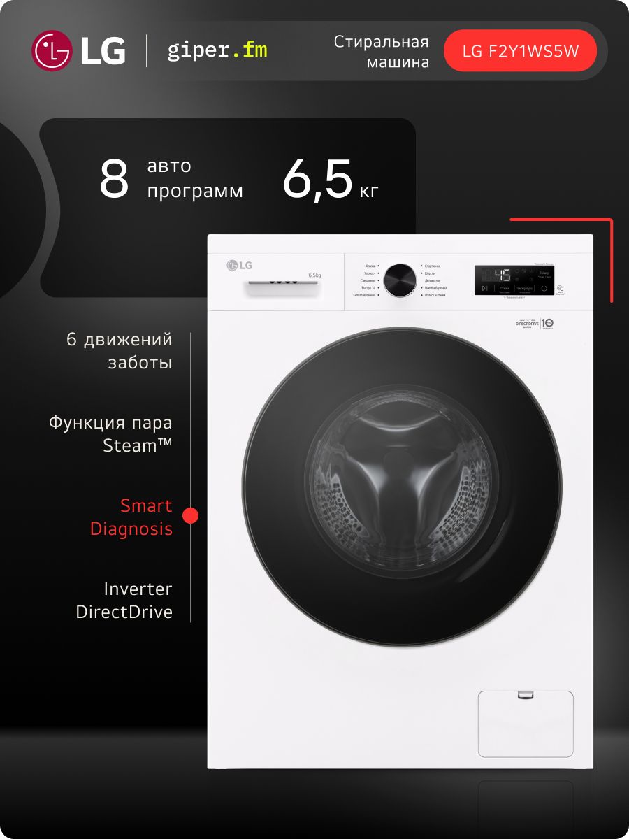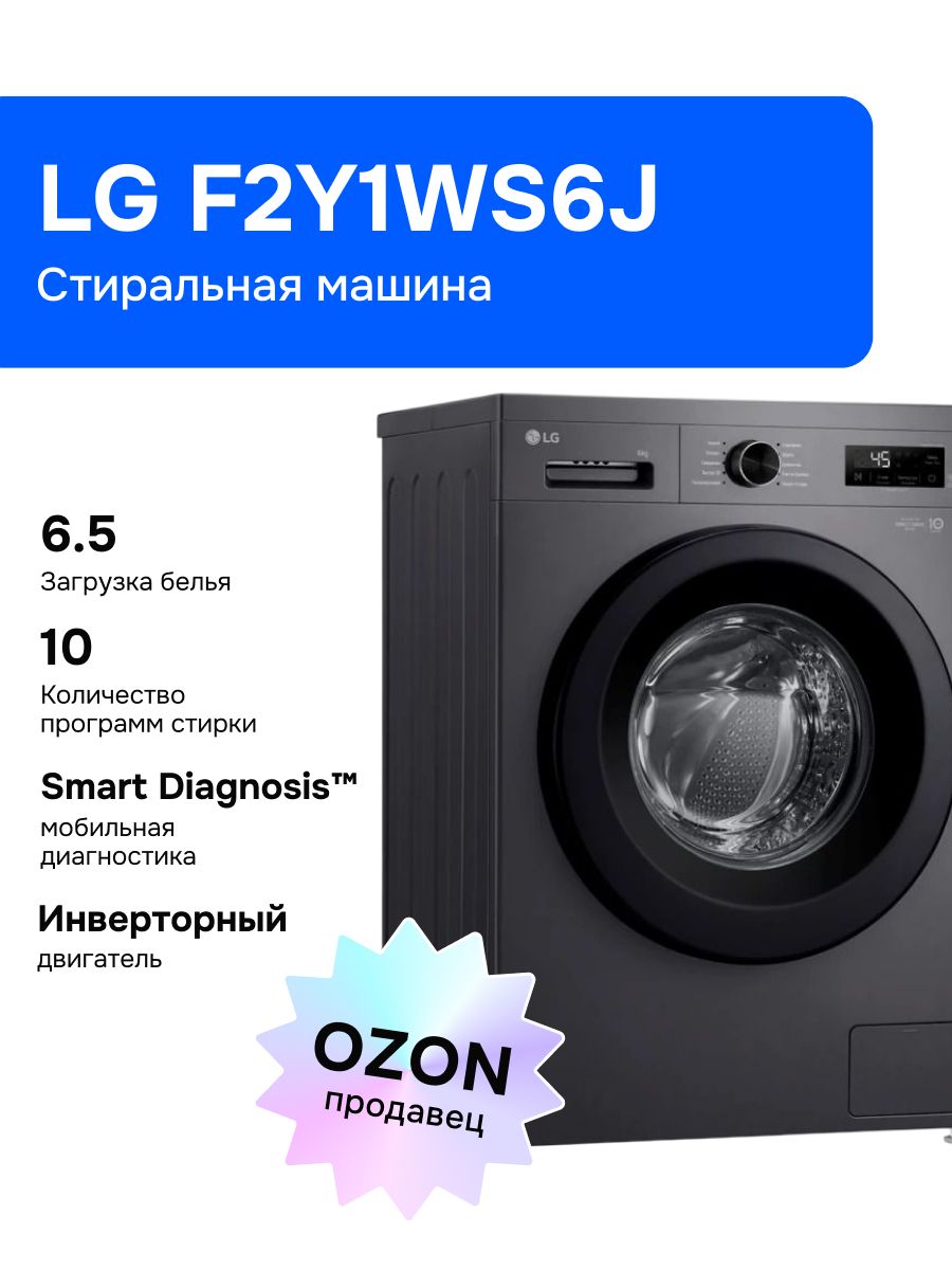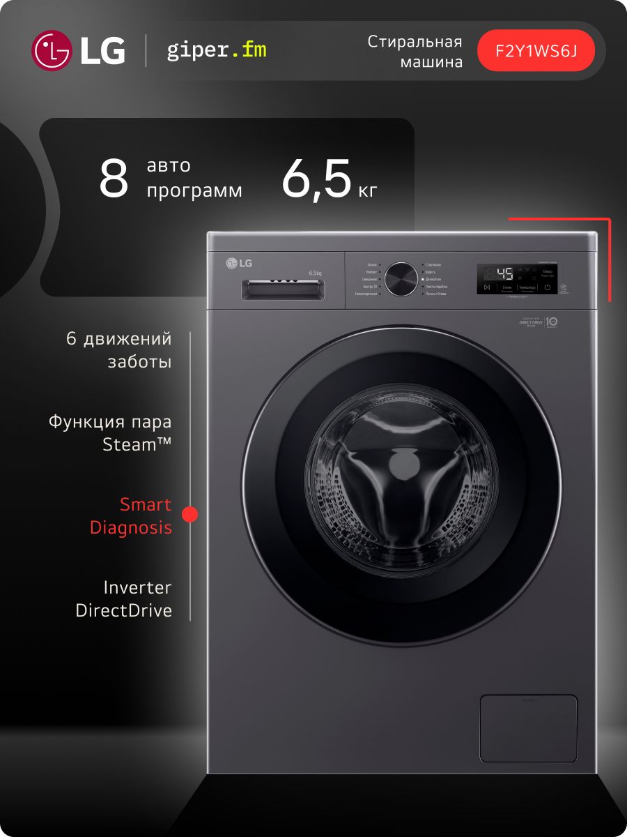 Стиральная машина LG F2Y1WS6J 6,5 кг, инверторный мотор с прямым приводом, функция пара Steam, 8 программ, для аллергиков и детской одежды, Smart Diagnosis, черный