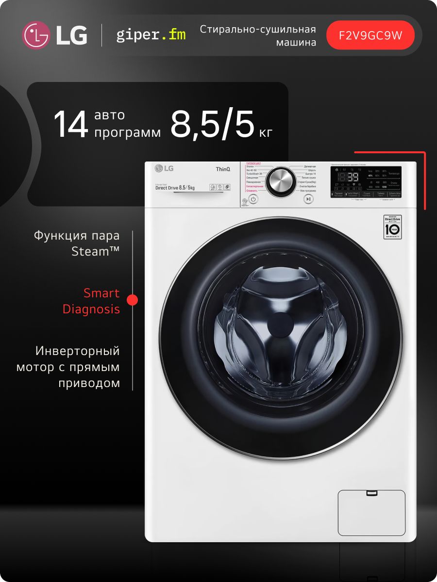 Стиральная машина LG F2V9GC9W с паром,1200 об/мин, 8.5 кг, 14 программ, дозагрузка белья, система AI DD, белая