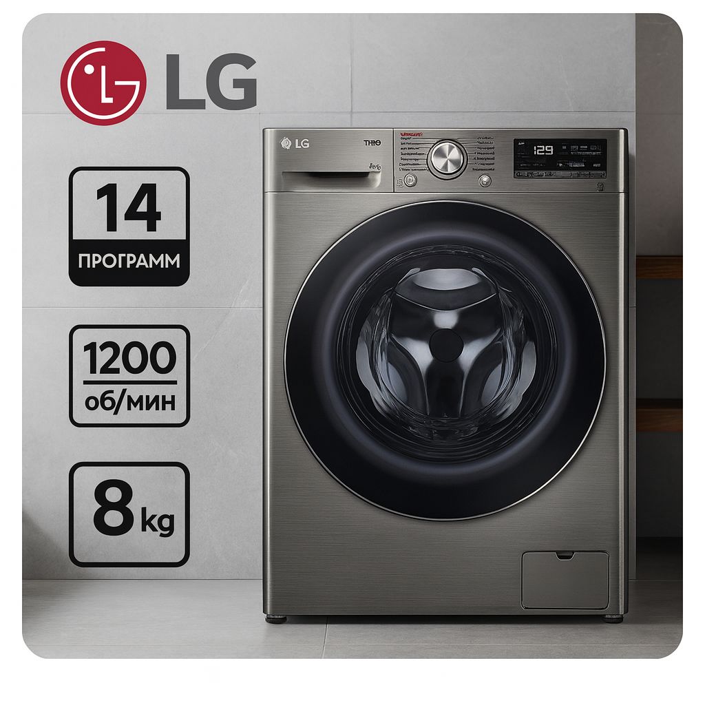 Стиральная машина LG F2V5PS2S, 8 кг, фронтальная загрузка, глубина 47.5, 14 программ, 1200 об/мин, паровая стирка Steam, серая