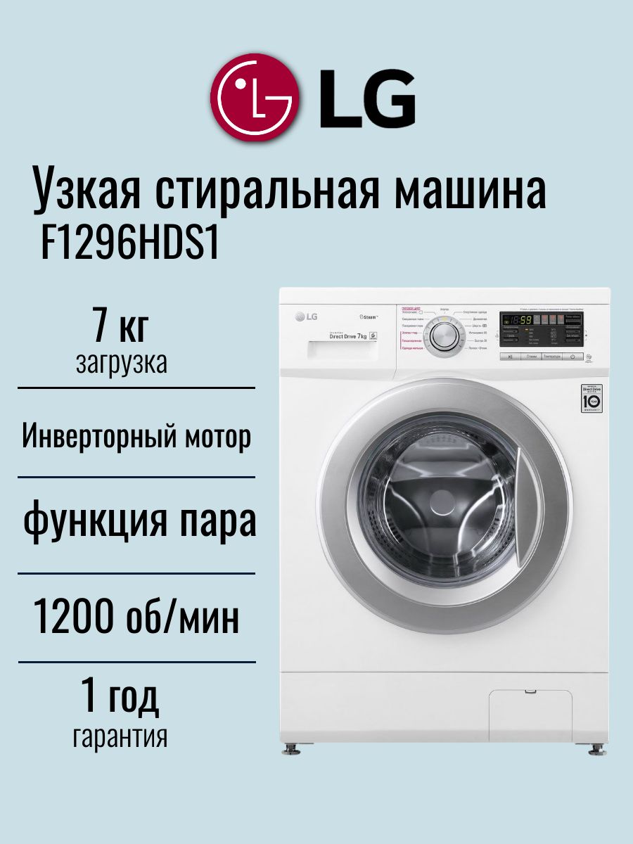 Узкая стиральная машина LG F1296HDS1 инверторный мотор с прямым приводом, 7 Кг, 1200 об/мин, 13 автоматических программ, с функцией пара