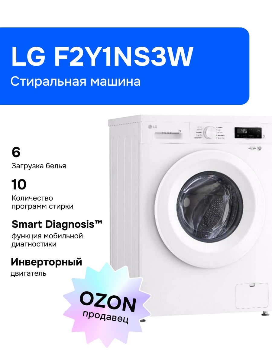 Стиральная машина LG F2Y1NS3W 6 кг, инверторный мотор с прямым приводом, функция пара Steam, 8 программ, для аллергиков и детской одежды, Smart Diagnosis, белый