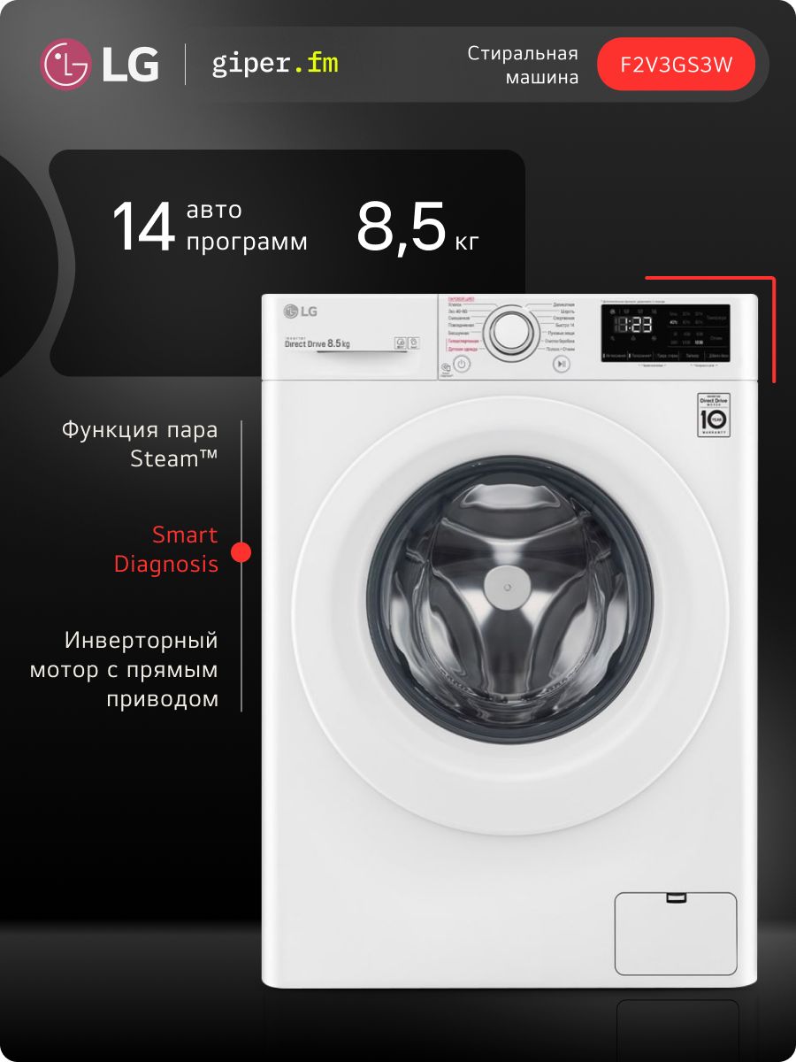 Стиральная машина узкая LG F2V3GS3W до 8,5 кг, 1200 об/мин, с 14 программами, интеллектуальной стиркой, дозагрузкой белья, обработкой паром, белая