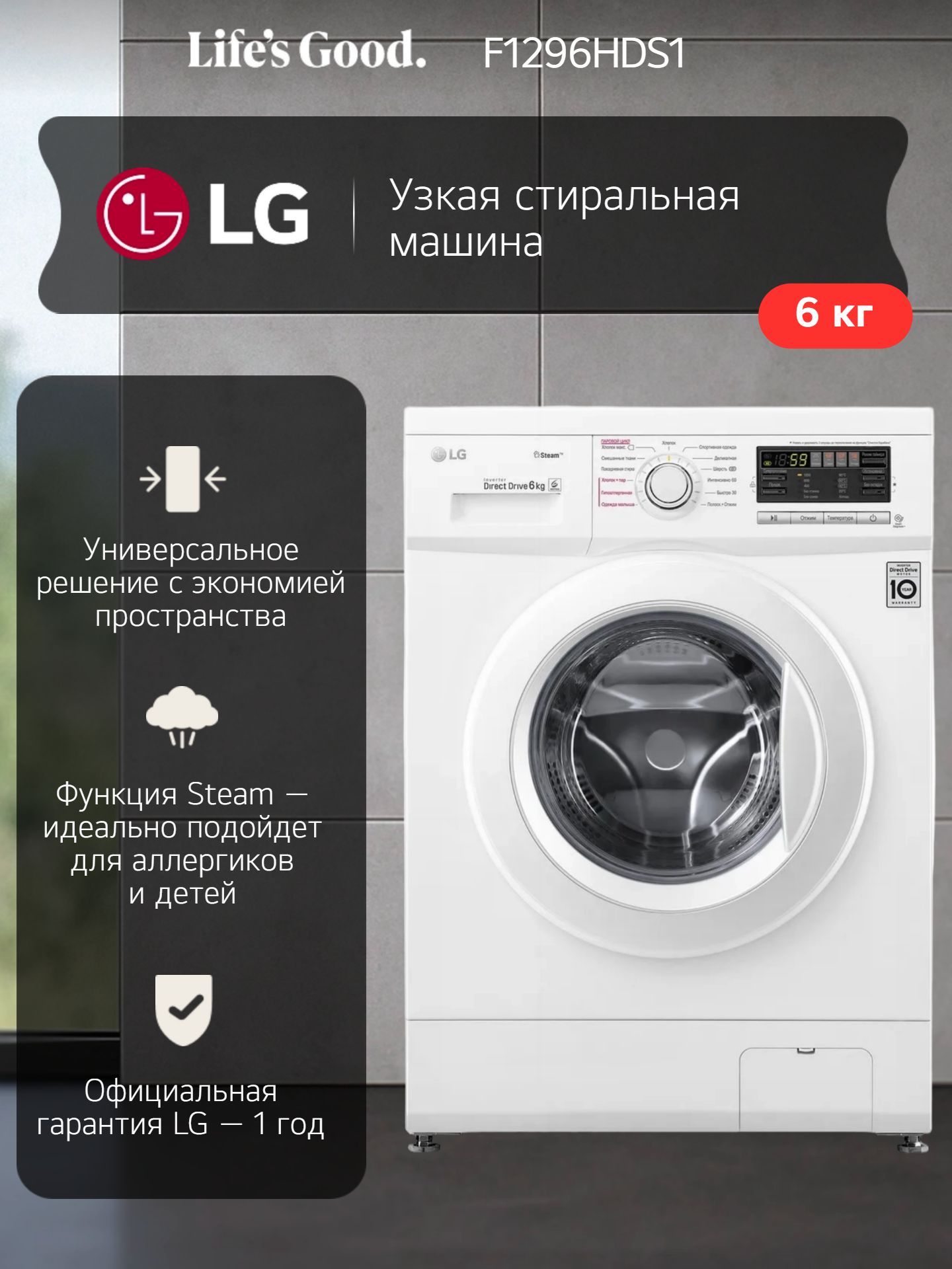 Узкая стиральная машина LG F1296NDS0 6 кг, функция пара, инверторный мотор с системой прямого привода, 8 программ, 6 движений заботы, для аллергиков и детской одежды, функция самодиагностики, белый