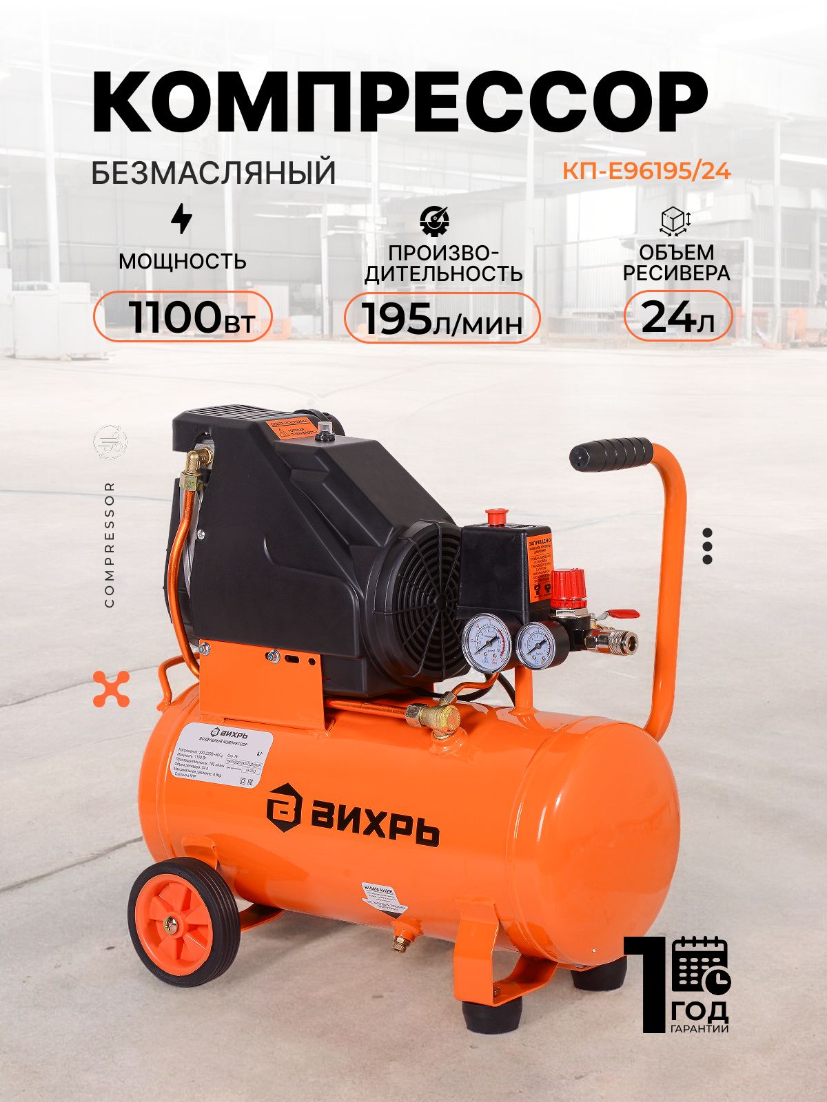 Компрессор воздушный безмасляный Вихрь 195 л/мин, бак 24 л, 8 бар, 1100 Вт, Поршневой / для покраски / для шиномонтажа, КП-E96195/24
