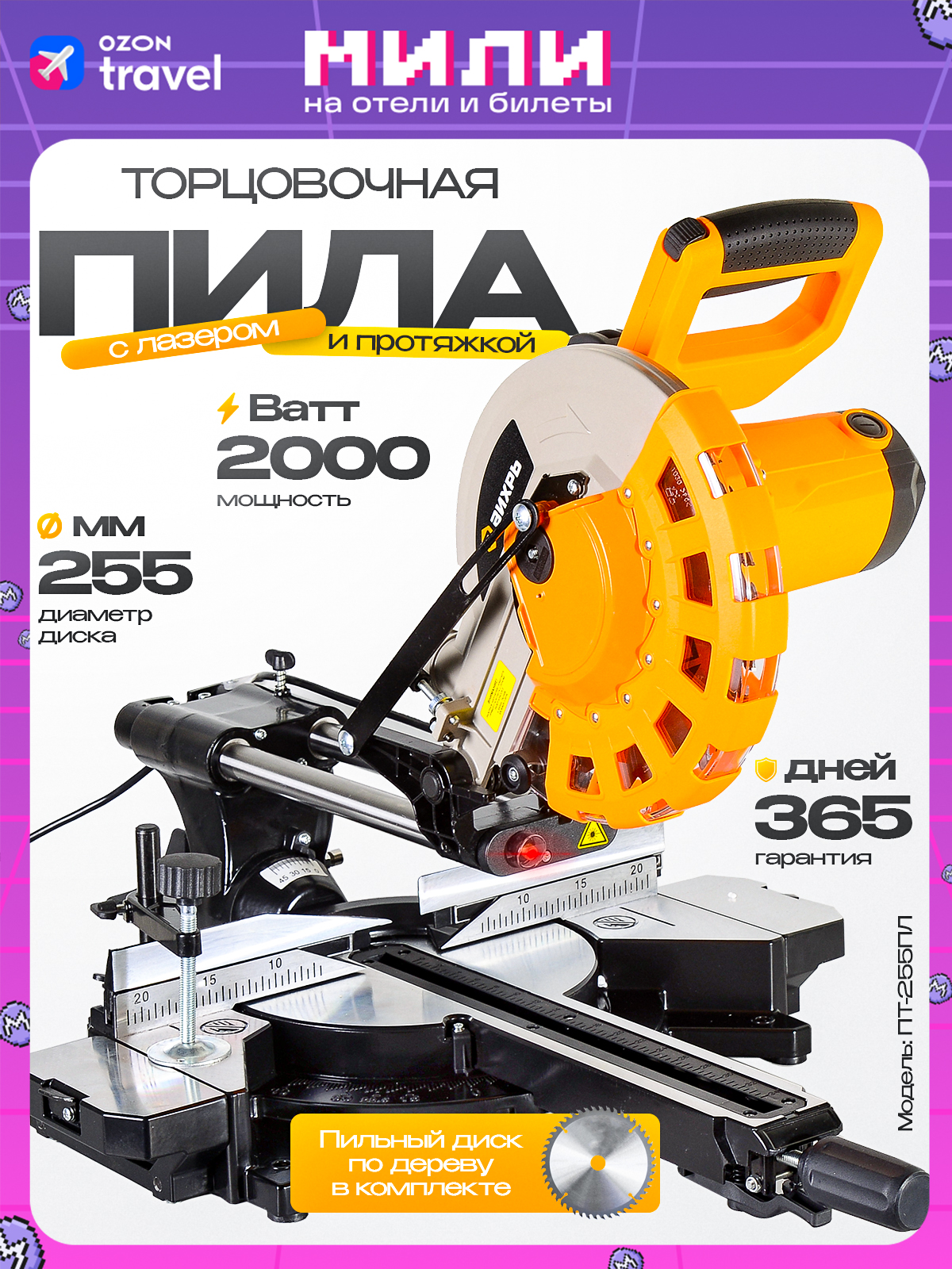 Торцовочная пила Вихрь с протяжкой, лазером- 2000Вт, диск 255мм, пропил 90г-80мм/45г-42мм, ; ПТ-255ПЛ