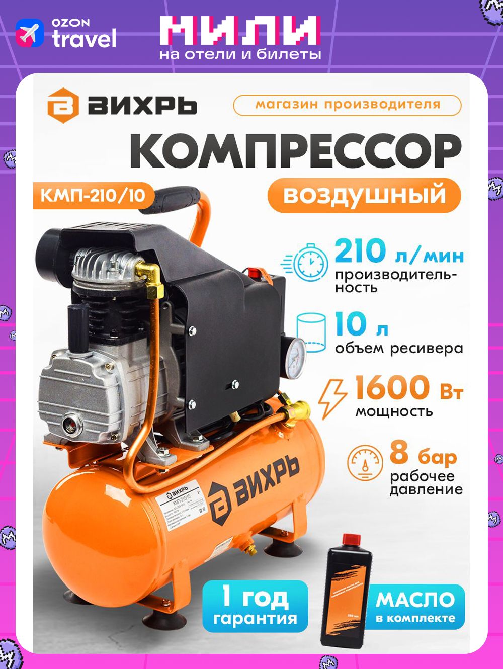 Компрессор воздушный 220В поршневой масляный для гаража Вихрь КМП-210/10 (Бак 10л, 1600Вт, 210 л/мин, 8бар, быстросъемный соединитель + кран+масло)