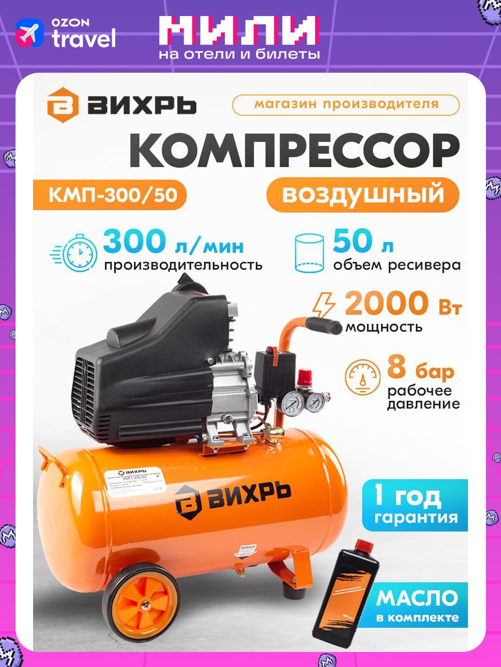 Компрессор воздушный КМП-300/50 220В для гаража Вихрь (Бак 50л, 2000Вт, 300 л/мин, 8бар, быстросъем.соед+кран)
