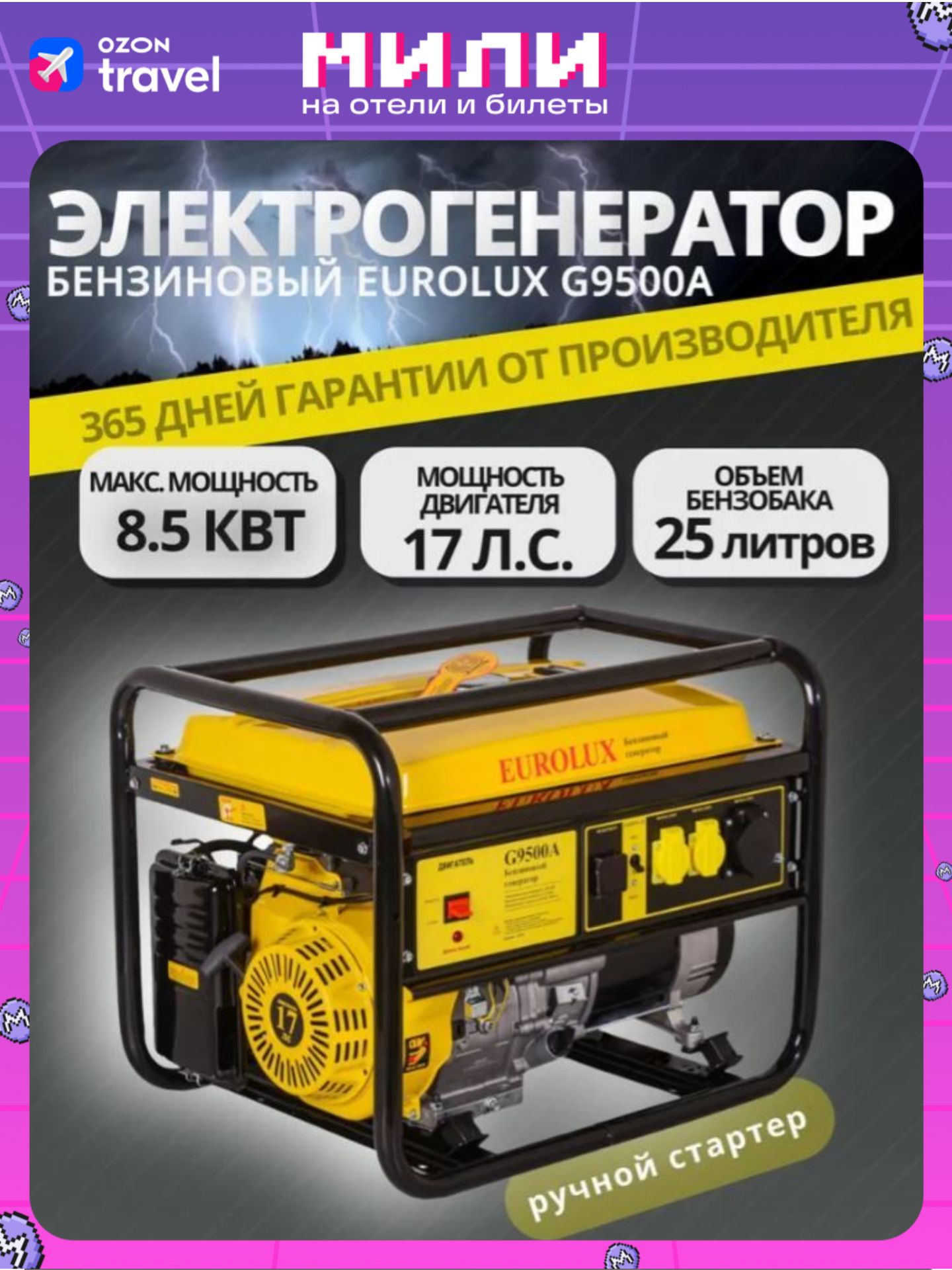 Генератор бензиновый EUROLUX G9500A (220 В, 8.5кВт, 17л.с. бак 25л)