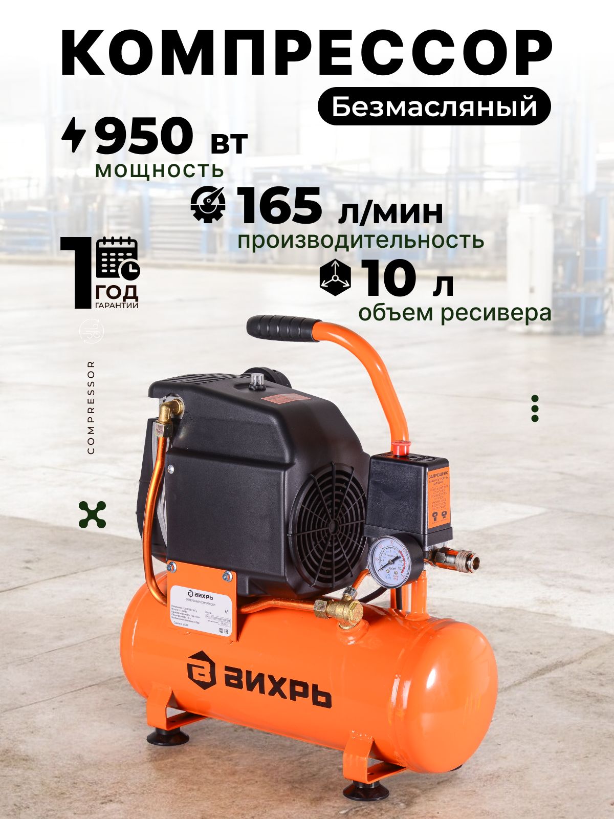 Компрессор воздушный безмасляный Вихрь 165 л/мин, бак 10 л, 8 бар, 950 Вт, 220 В, Воздушный / для шиномонтажа, КП-Е96165/10