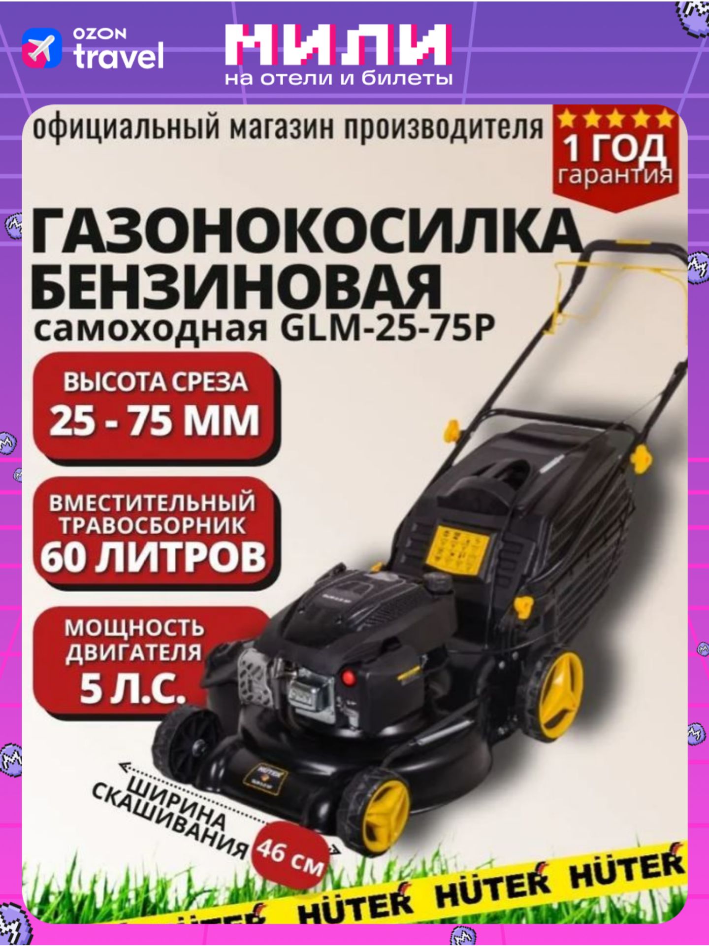 Газонокосилка бензиновая самоходная GLM-25-75P Huter - 5 л.с., пластиковый травосборник 60л; ширина среза 460 мм; мульчирование; стальной нож; высота среза 25-75 мм