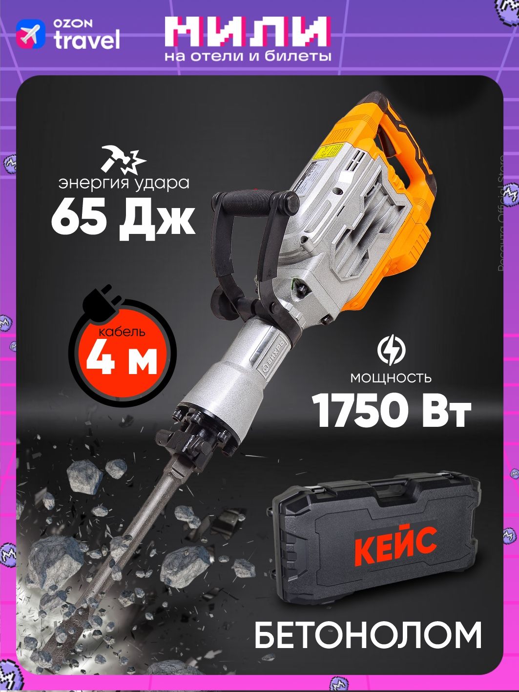 Отбойный молоток электрический Вихрь - 1750 Вт, 2000 уд/мин, в кейсе на колесах, пика и долото в комплекте; ОМ-65А