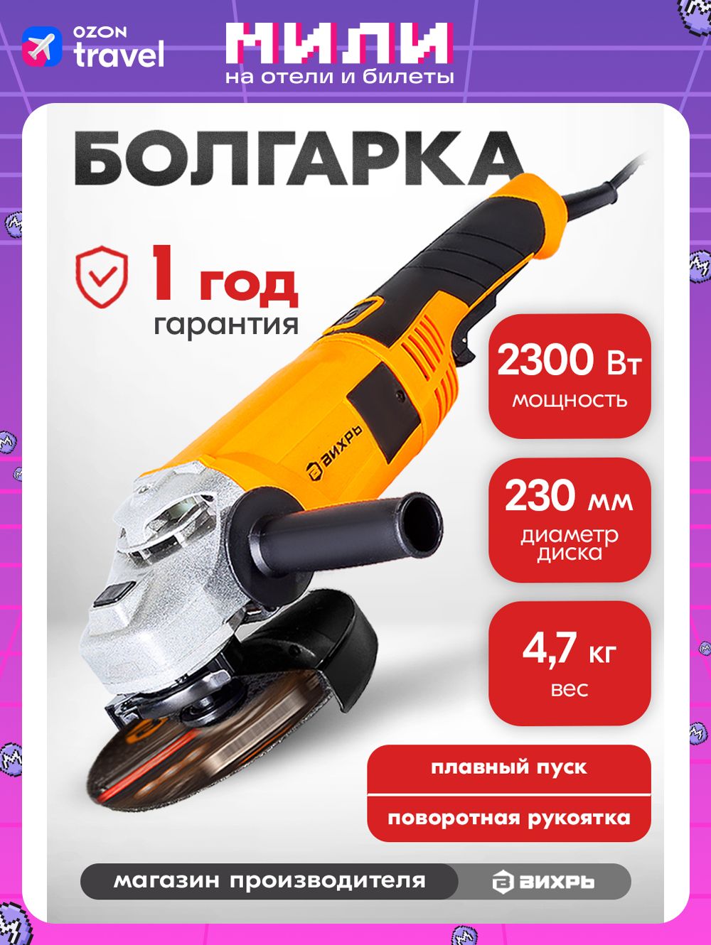 Болгарка 230 мм, 2300 Вт УШМ-230/2300 Вихрь, 6000 об/ мин, болгарка 230 мм