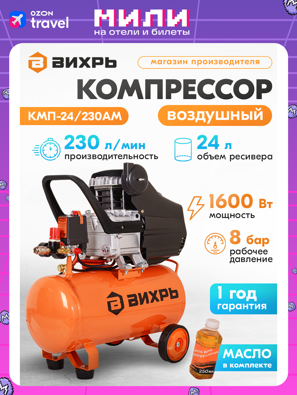 Компрессор воздушный масляный Вихрь для гаража КМП-24/230АМ - 24 л, 1600 Вт, 230 л/мин, 8 бар