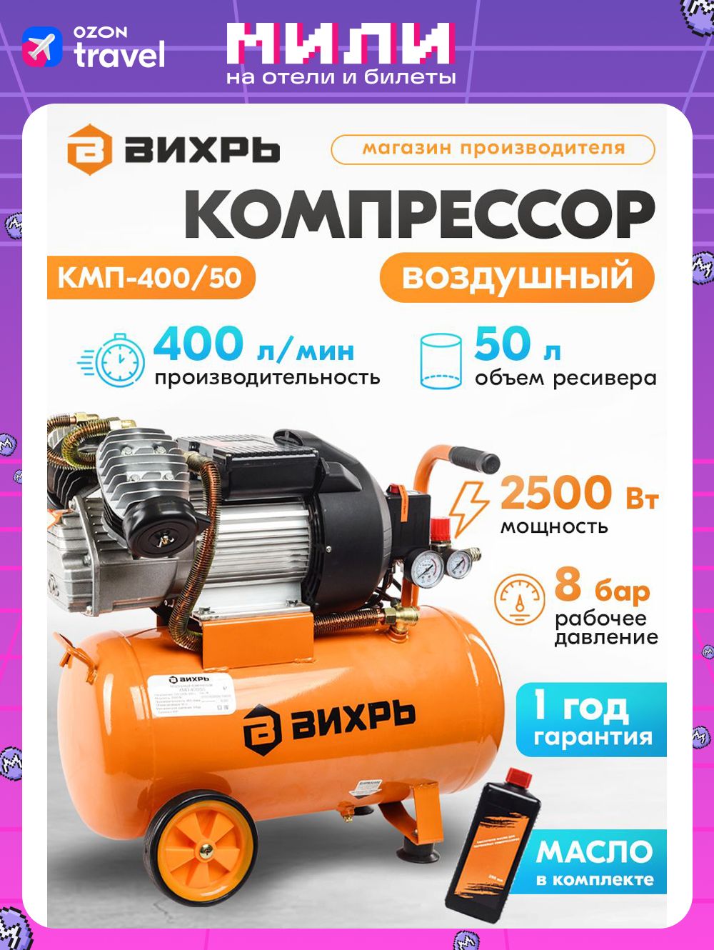Компрессор воздушный масляный Вихрь 220В, 50 л КМП 400/50 Вихрь, 2х-поршневой, 2500В