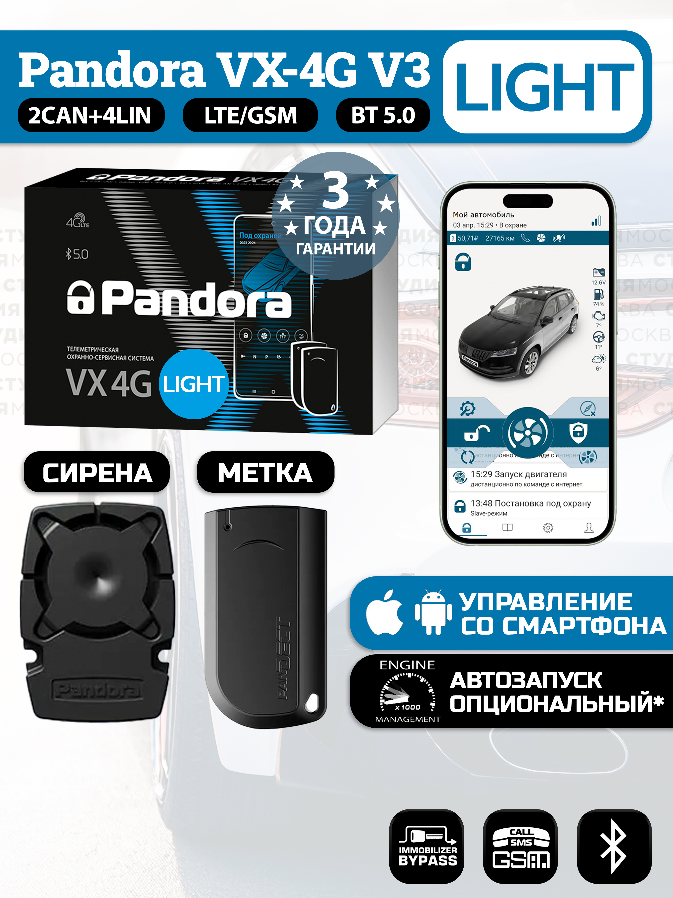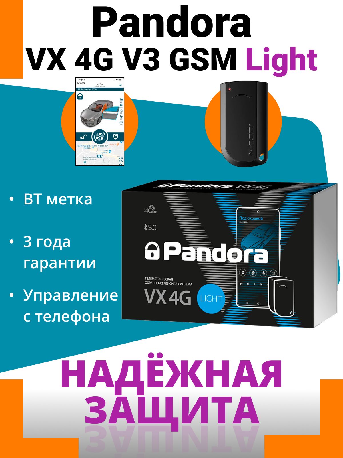 Pandora VX-4G v3 LIGHT Автосигнализация (опц. автозапуск, LTE/GSM, Bluetooth 5.0, метка, пьезосирена, 2CAN+4LIN)