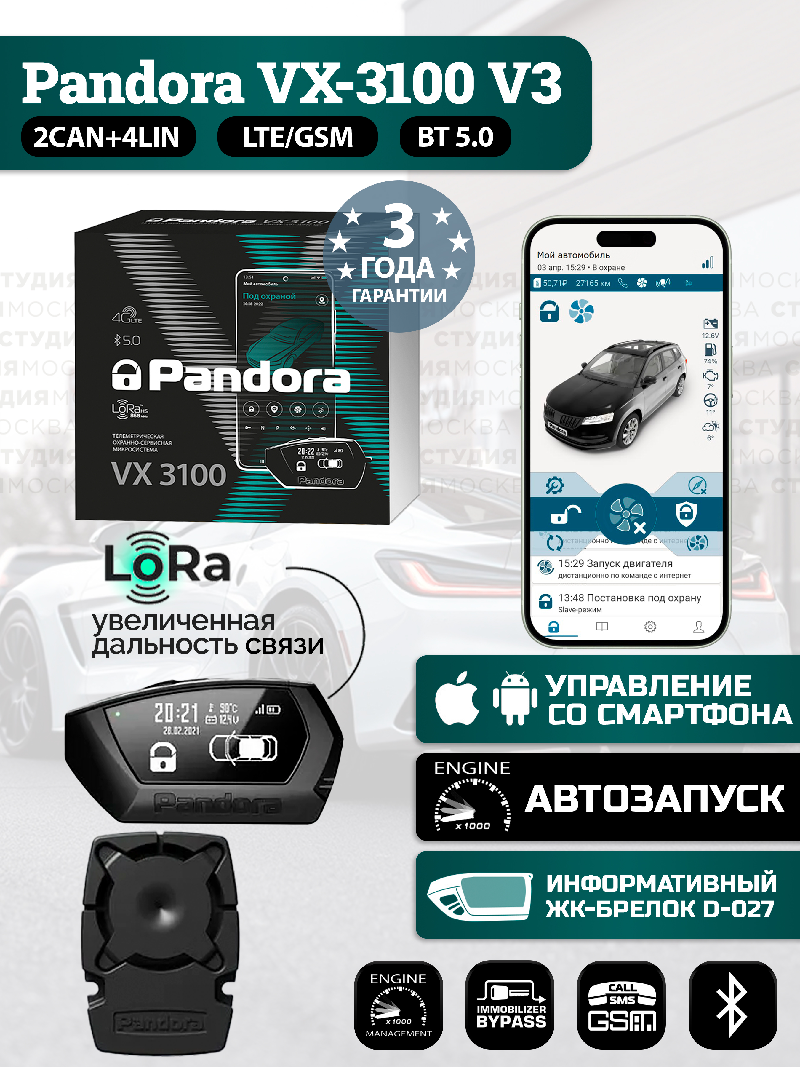 Pandora VX 3100 v3 Автосигнализация (автозапуск, LTE/GSM, Bluetooth 5.0, ЖК-Брелок с увеличенной дальностью LoRa)