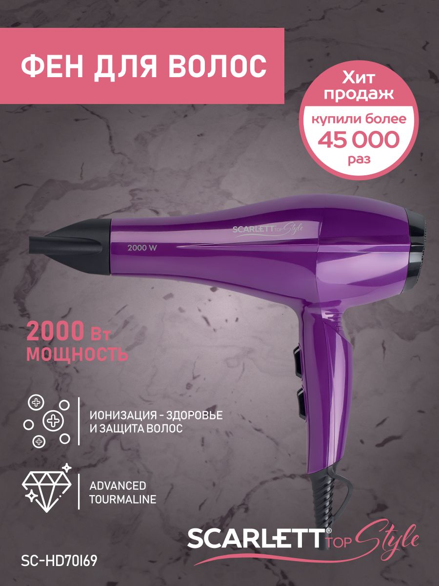 Scarlett Фен для волос SC-HD70I69 2000 Вт, скоростей 2, кол-во насадок 1, фиолетовый