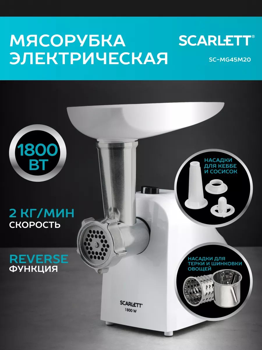 Электрическая мясорубка Scarlett с реверсом, овощерезкой с 2 барабанами для терки и шинковки, двумя решетками 5 и 7 мм, насадками для колбасок и кеббе и отсеком для хранения диска, 1800 Вт