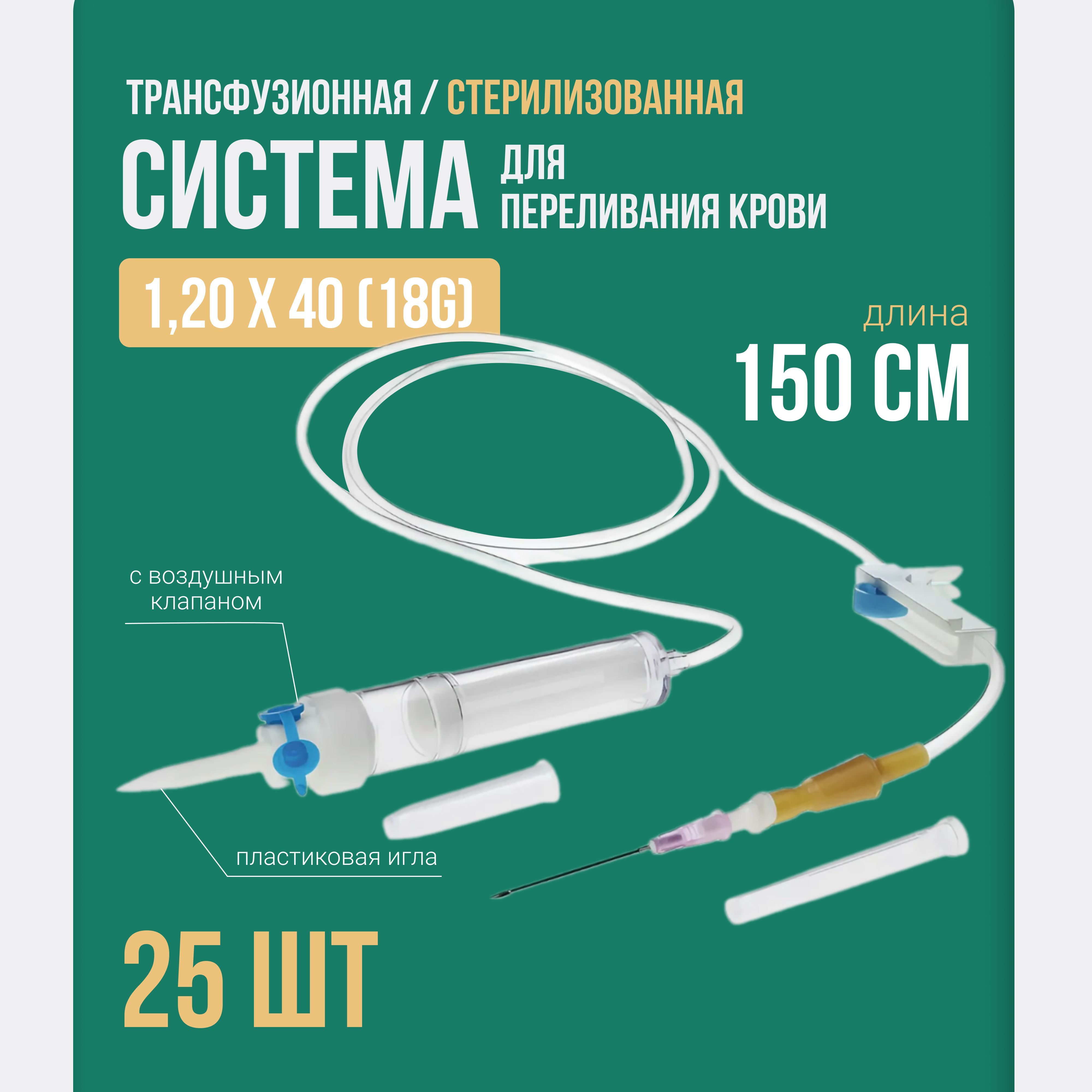 Система ТРАНСФУЗИОННАЯ для переливания растворов, для капельниц, с иглой 1,20 х 40 - 18G, SFM, 25 штук