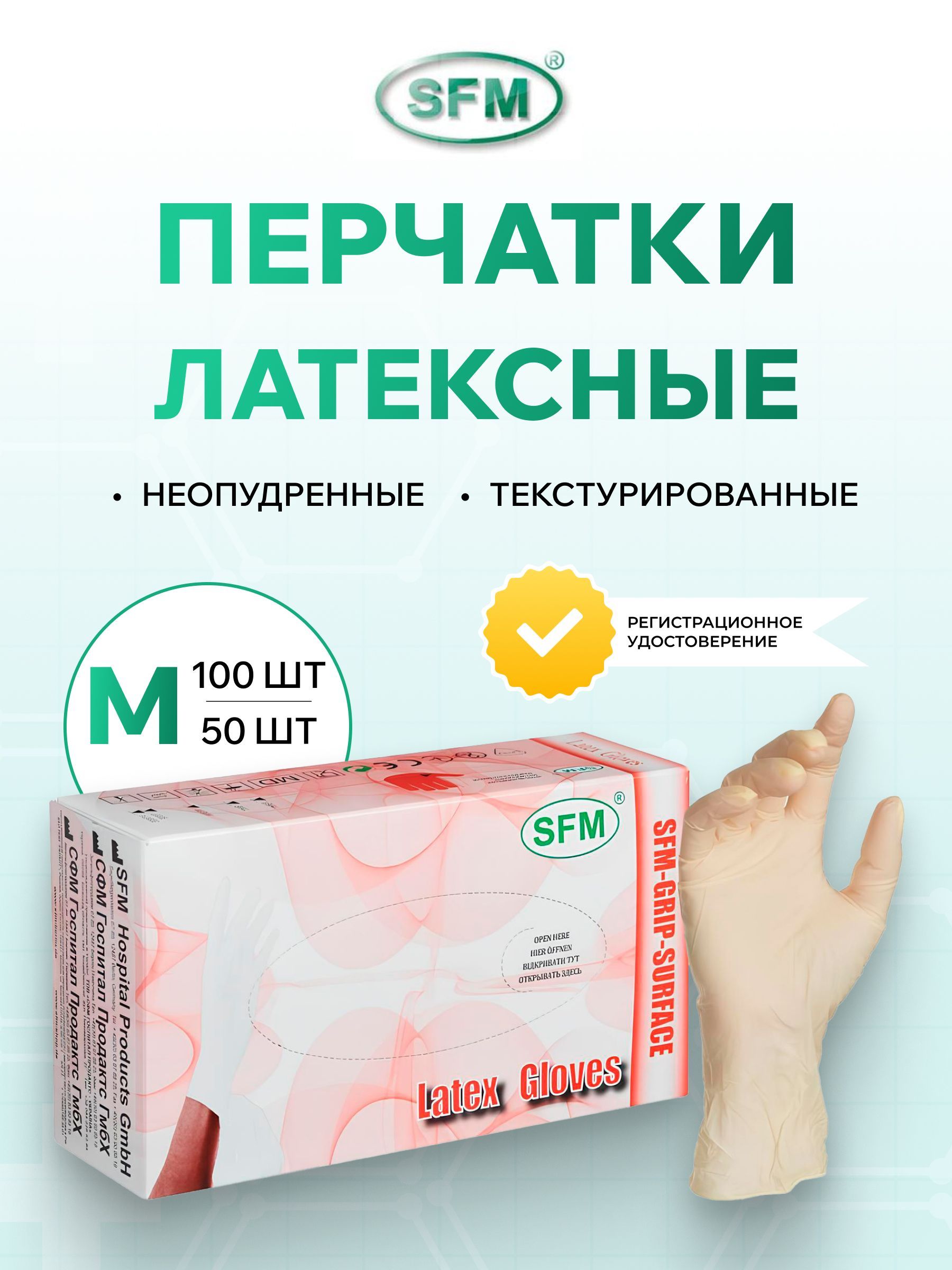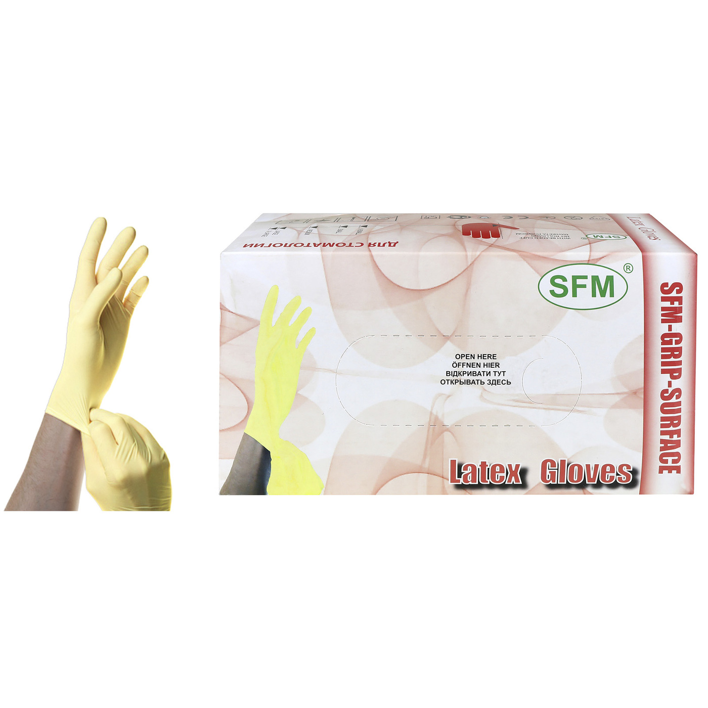 Перчатки медицинские смотровые латексные SFM текстурированные нестерильные неопудренные размер M (7-8) желтые (50 пар/100 штук в упаковке)