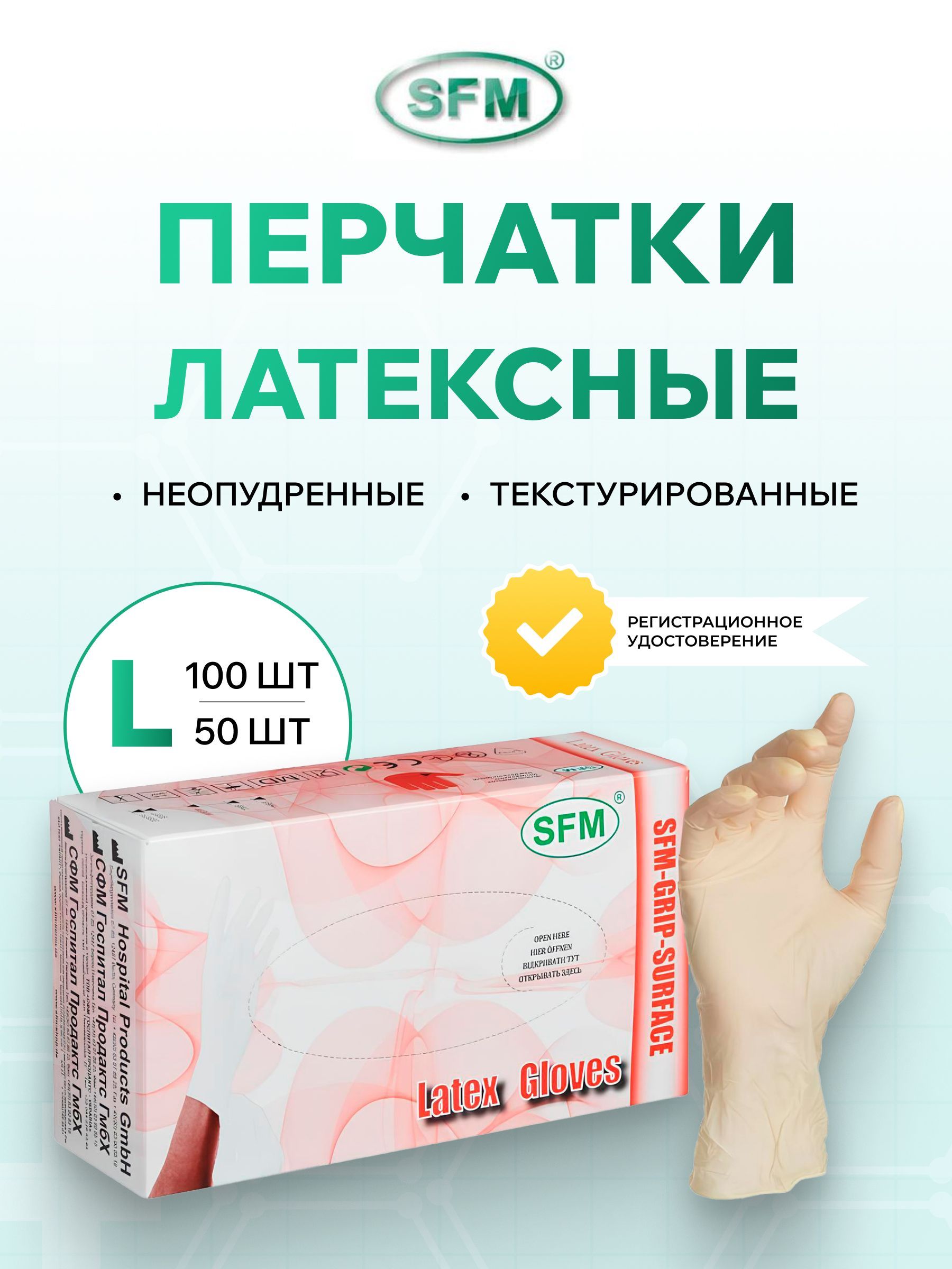 Перчатки медицинские смотровые латексные SFM текстурированные нестерильные неопудренные размер L (8-9) желтые (50 пар/100 штук в упаковке)