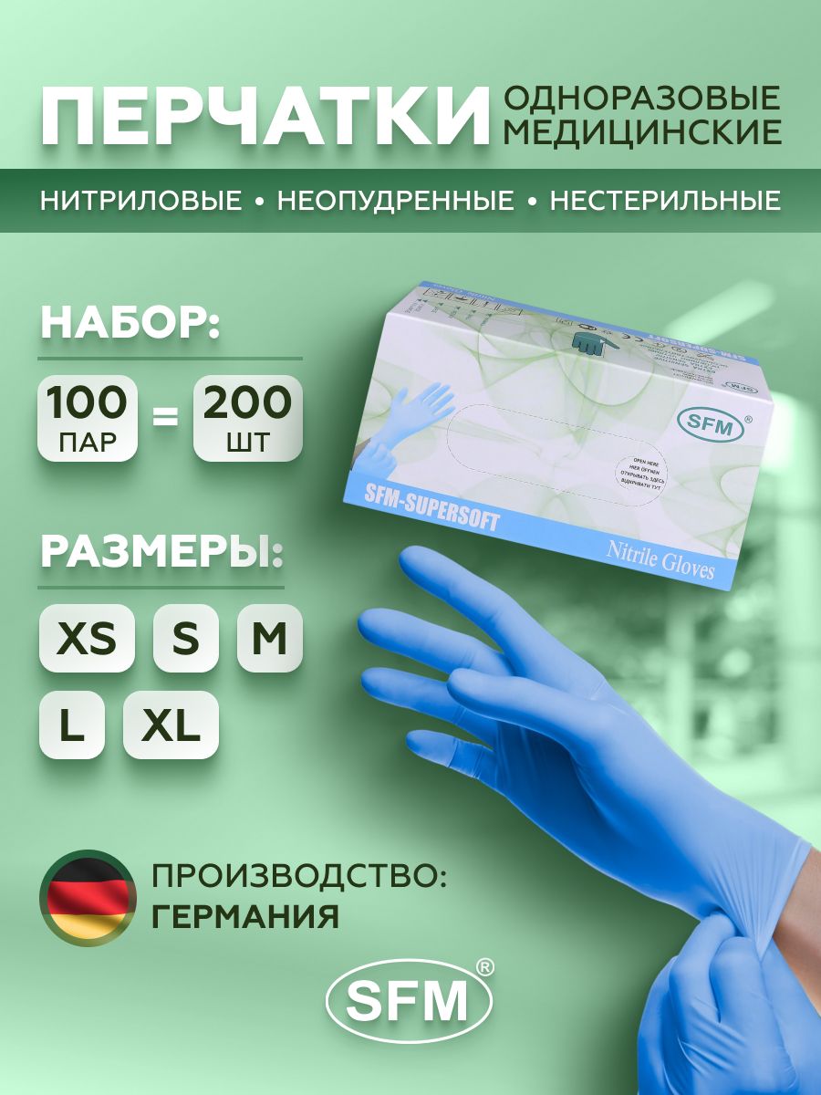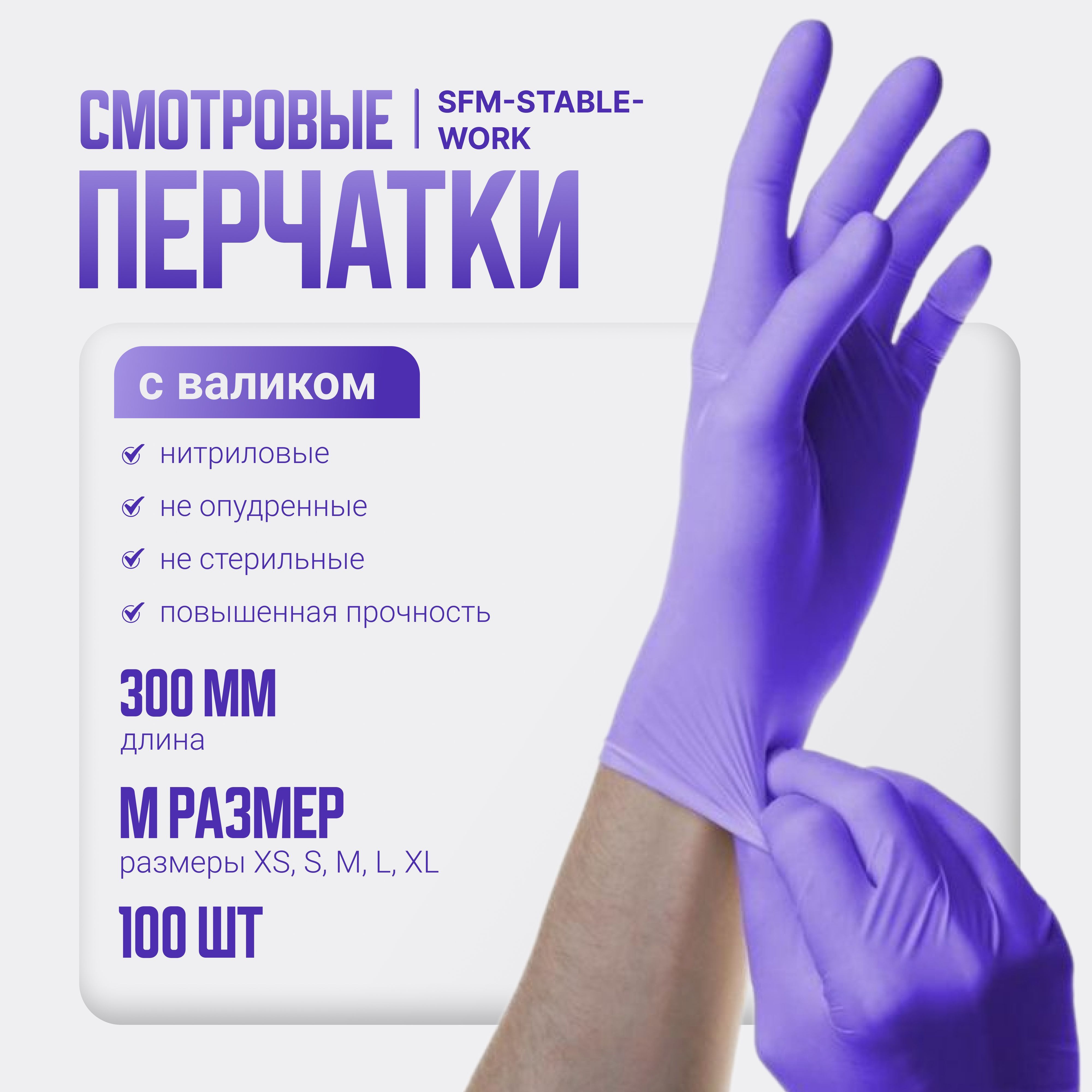 Перчатки смотровые SFM НИТРИЛОВЫЕ нестерильные неопудренные текстурированные, хлоринация однократная, размер М, 100 пар, ФИОЛЕТОВО-ГОЛУБОЙ