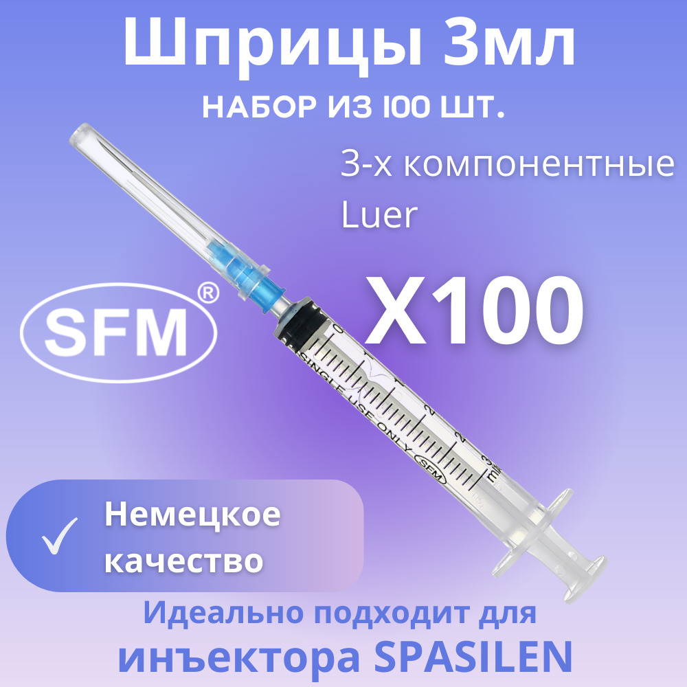 Шприц медицинский 3мл комплект 100 шт. SFM Luer (3-х компонентный), одноразовый, стерильный, с надетой иглой 0,6 x 30 - 23G, для инъекций и уколов (подходит для инъектора Spasilen/Спасилен)(блистер)
