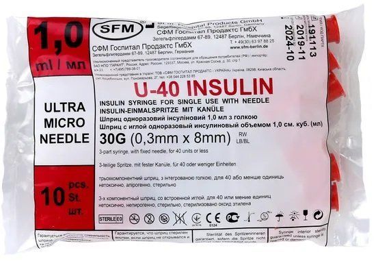 Шприц с иглой одноразовый инсулиновый SFM 1мл U-40 30G (0,3ммx8мм) №10