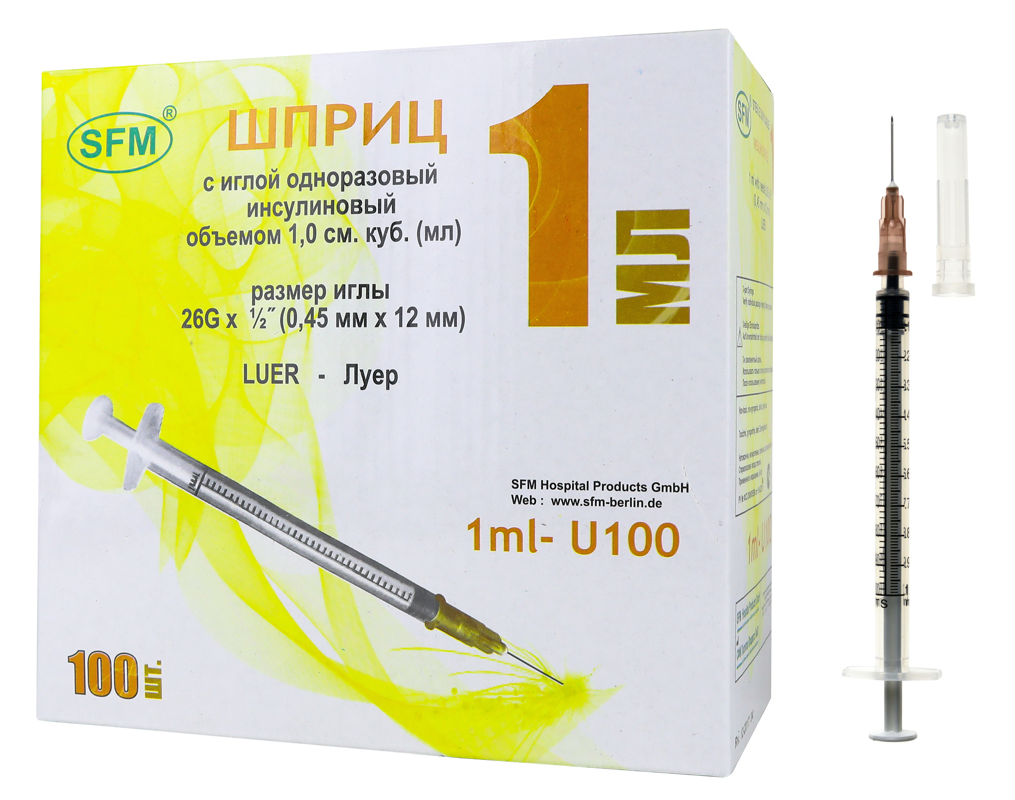 Шприц инсулиновый 1 мл U-100 с надетой иглой 0,45х12 - 26G SFM 100 штук