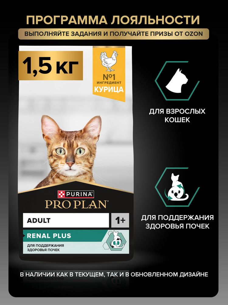 Сухой корм PRO PLAN® RENAL PLUS для взрослых кошек для поддержания здоровья почек, с высоким содержанием курицы, 1.5 кг