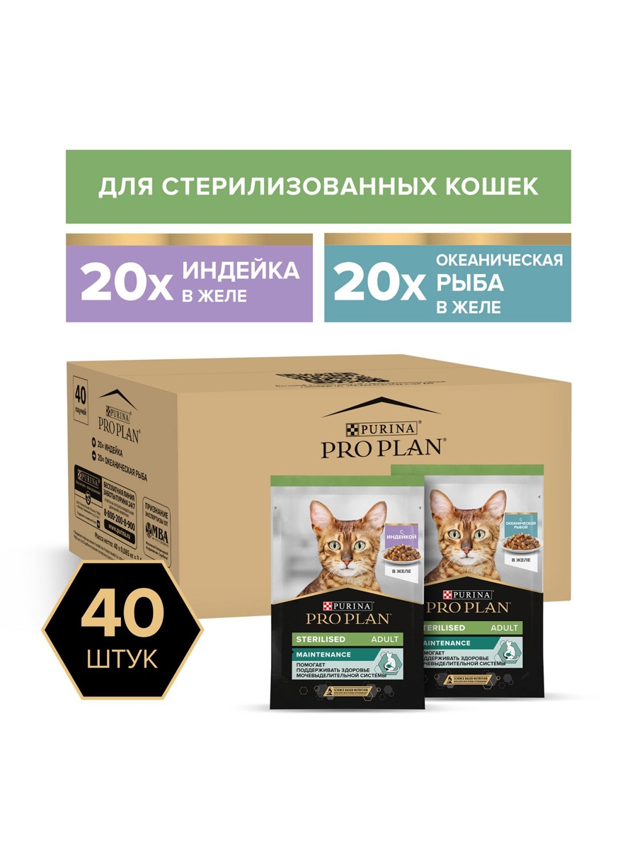 Влажный корм для стерилизованных кошек PRO PLAN Sterilised, вкусные кусочки с индейкой в желе, с океанической рыбой в желе, 85 г х 40 шт