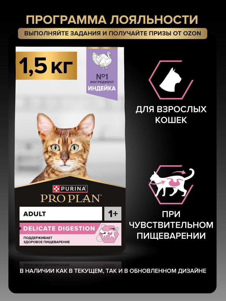 Сухой корм PRO PLAN Delicate Digestion для взрослых кошек с чувствительным пищеварением, с индейкой, 1,5 кг