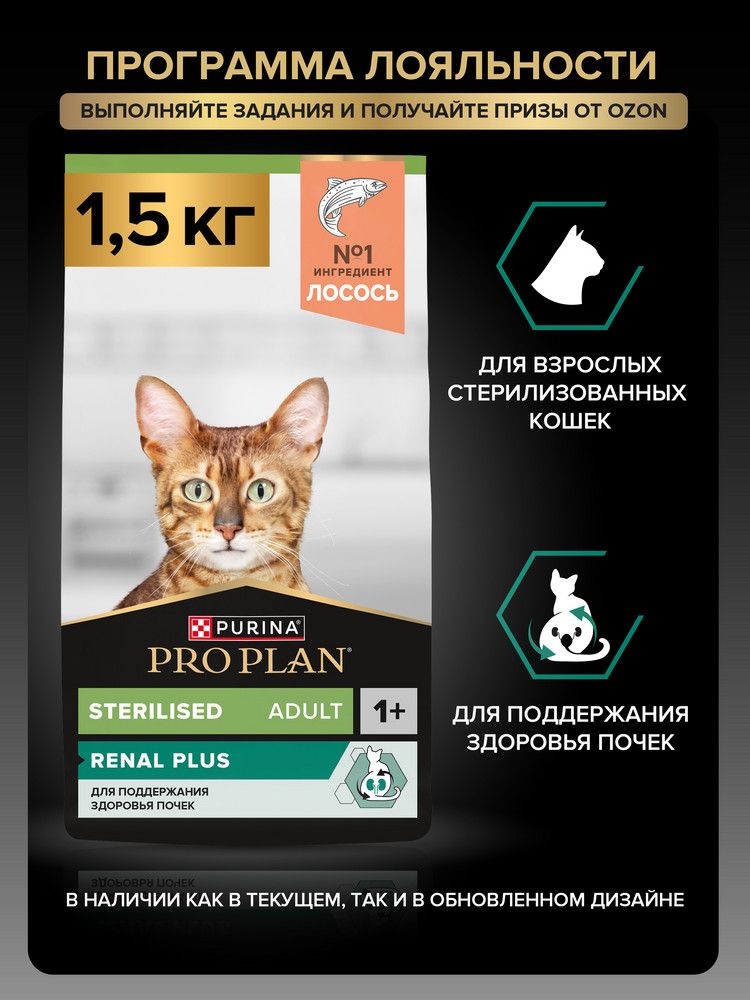 Сухой корм PRO PLAN Sterilised Renal Plus для взрослых стерилизованных кошек для поддержания здоровья почек, с индейкой, 1,5 кг