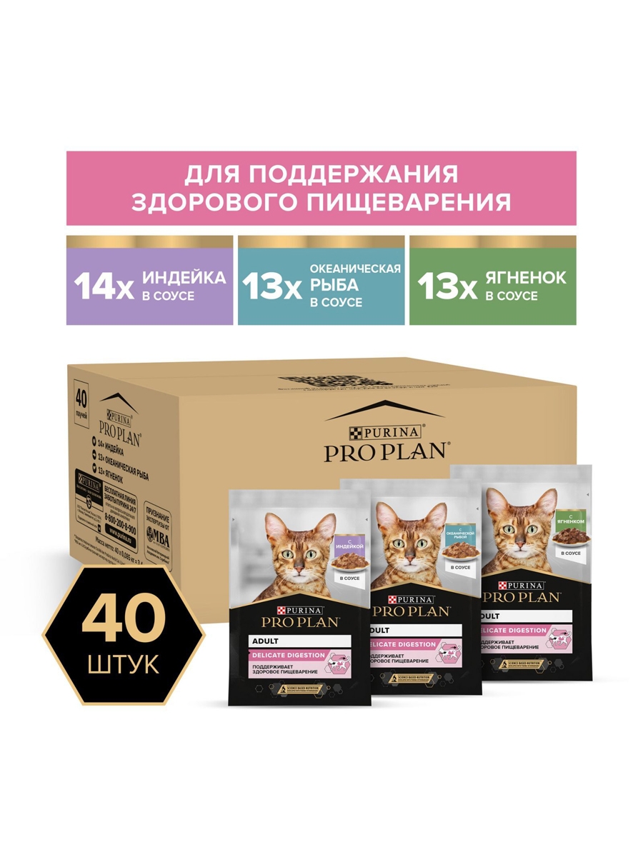 Влажный корм для кошек с чувствительным пищеварением PRO PLAN, микс с индейкой, ягненком, океанической рыбой в соусе, 85 г х 40 шт