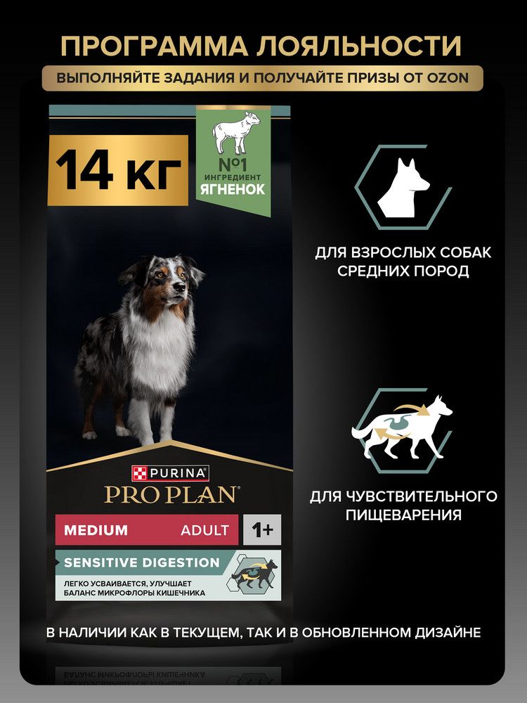 Сухой корм PRO PLAN Sensitive Digestion для взрослых собак средних пород с чувствительным пищеварением, с ягненком, 14 кг