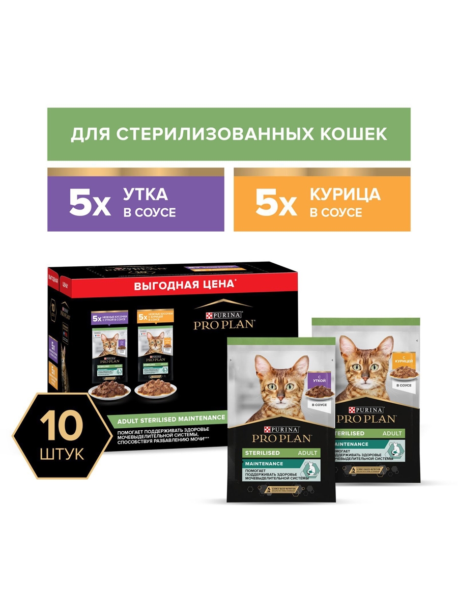 Влажный корм PRO PLAN® Sterilised MAINTENANCE для взрослых стерилизованных кошек с уткой в соусе, с курицей в соусе 85 г х 10 шт.