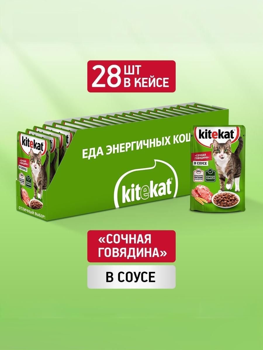 Влажный корм KITEKAT™ для кошек со вкусом говядины в соусе «Сочная говядина», 28 шт по 85г