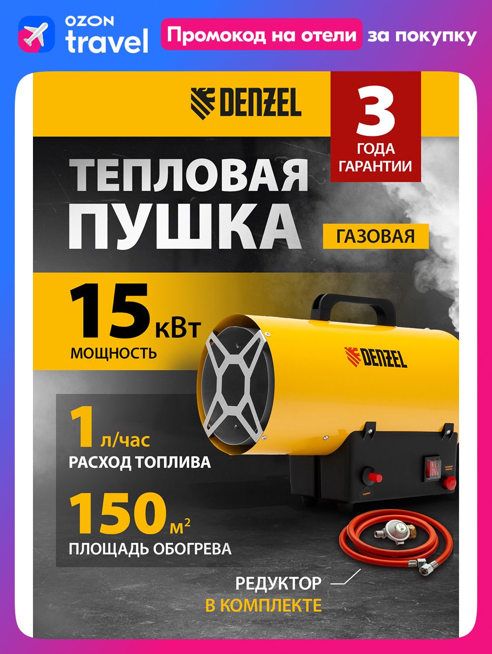 Газовая пушка тепловая DENZEL GHG-15, 15 кВт мощность и 150 м2 площадь обогрева, защита от перегрева и пьезоподжиг, пропан-бутан, вилка и шланг с редуктором в комплекте 96477
