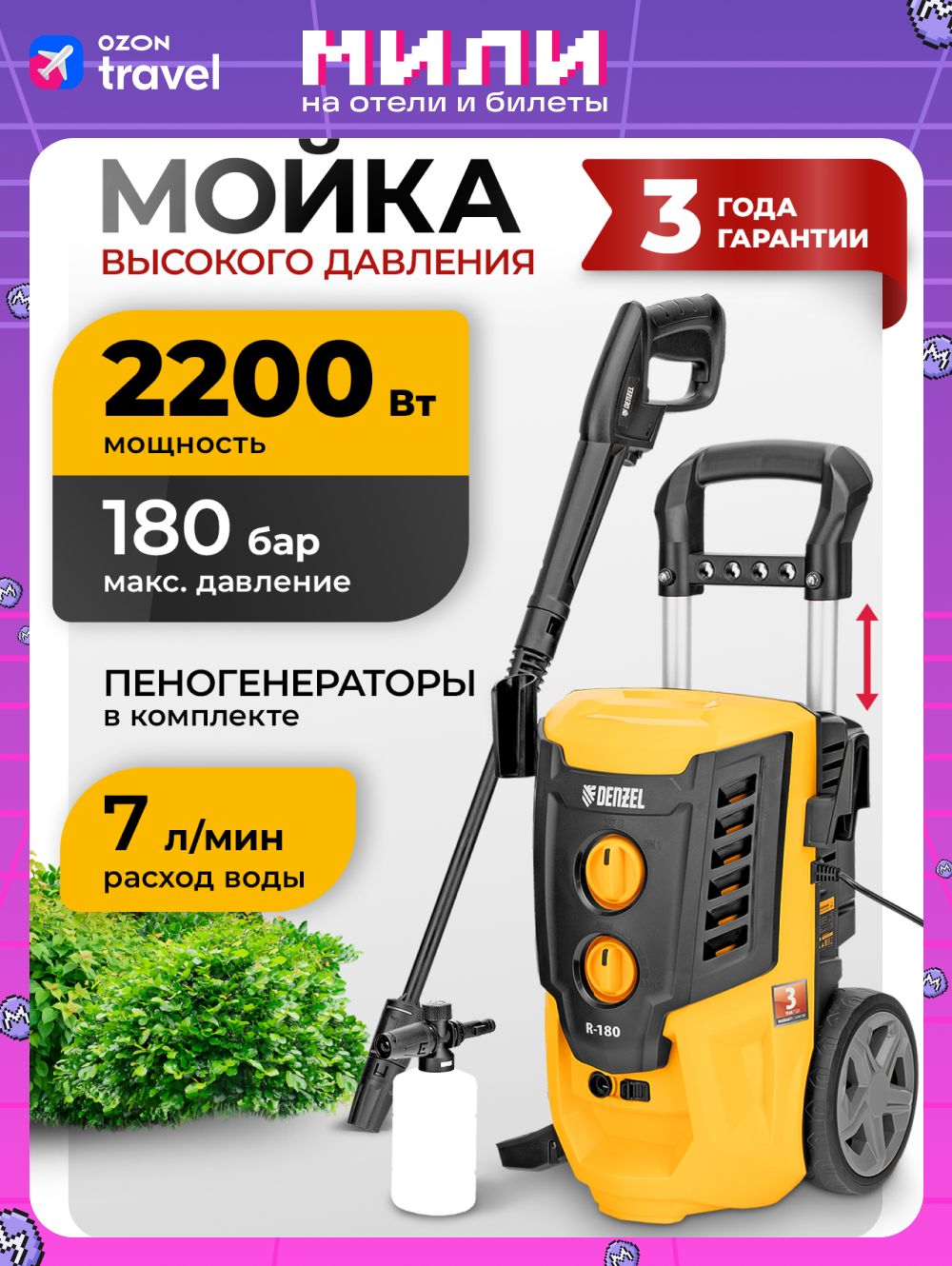 Мойка высокого давления DENZEL R-180, 2200 Вт, 180 бар, 380 л/ч, функция самовсасывания и термозащита, алюминиевая помпа, внешний/встроенный пеногенератор и грязевая фреза, моечная машина 58238