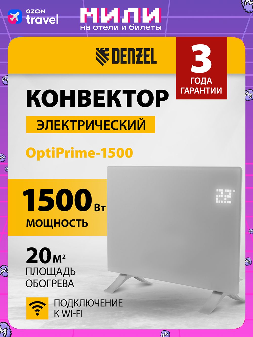 Конвектор электрический DENZEL OptiPrime-1500, 750/1500 Вт мощность и 20 м2 площадь обогрева, подключение по Wi-Fi и цифровой термостат, таймер и пульт, 98122