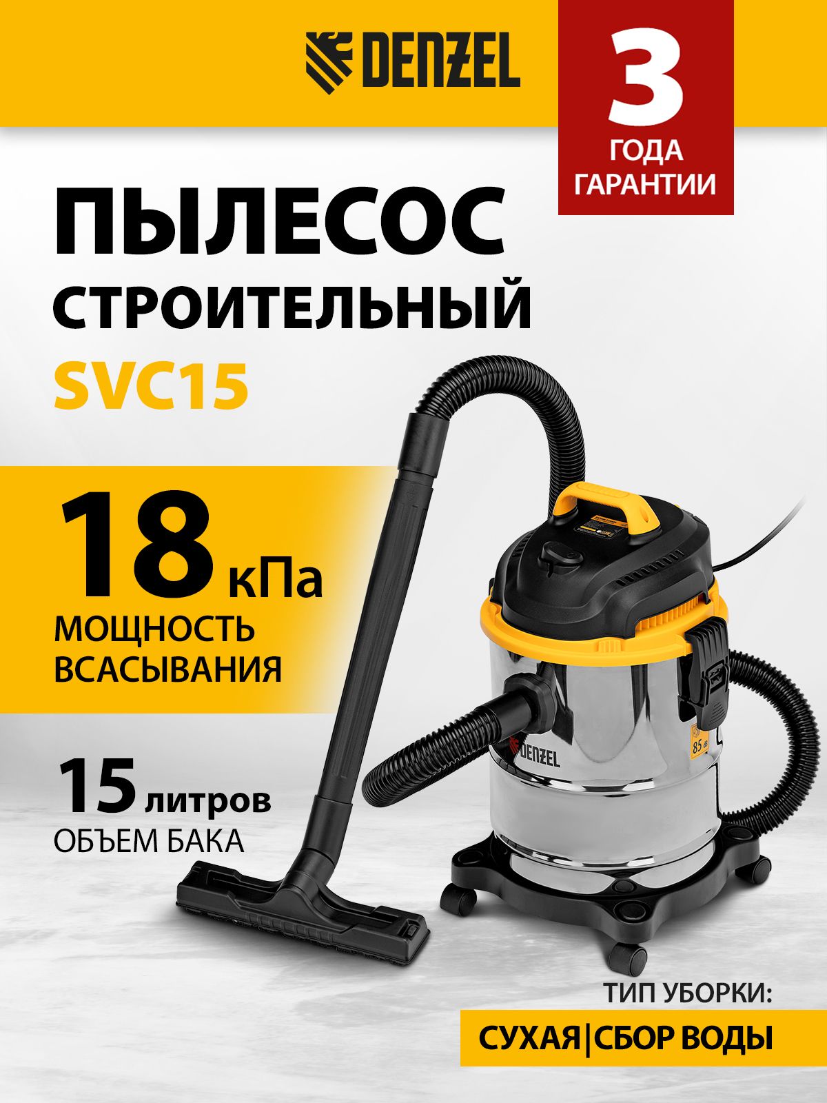 Пылесос строительный DENZEL SVC15, 1200 Вт мощность и 15 л объем бака, сбор воды и выдув, мешки и фильтры в комплекте 28201
